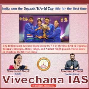 On 14 December 2025, Indian squash reached a defining milestone as India won its maiden Squash World Cup in Chennai. The victory at the Express Avenue Mall marked not just a sporting achievement but a historic moment for Indian squash, as It also placed India among an elite group as it became only the fourth country after Australia, England and Egypt to win the Squash World Cup and the first Asian nation to lift the prestigious trophy.1